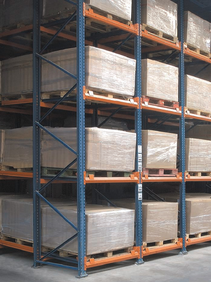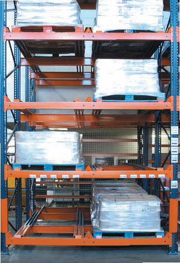 Push Back rack is recommended when you have multiple SKU's and multiple pallets of each SKU. Since push back can be up to six pallets deep, you can store up to six pallets of each SKU while maintaining the ability of selecting a pallet of each SKU.