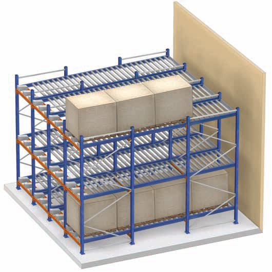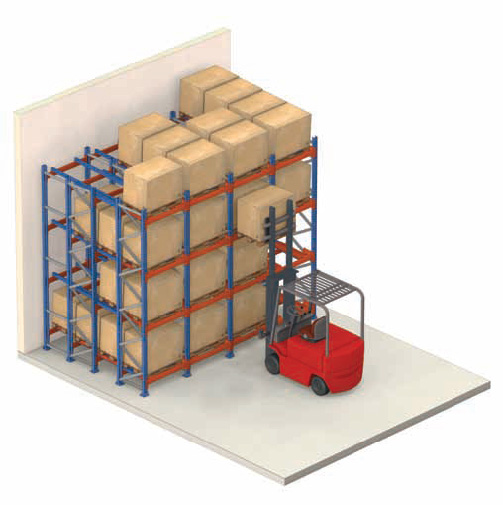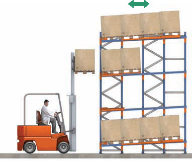 Goods are loaded and unloaded from the same aisle, first pallet is placed on the first position of each lane. Push Back rack high density storage rack designed to allow for both selectivity and dense storage. Push Back rack is named such because the pallet is placed by the lift truck onto a "cart" and then "pushed back" into the rack by the next pallet being loaded into the rack system.