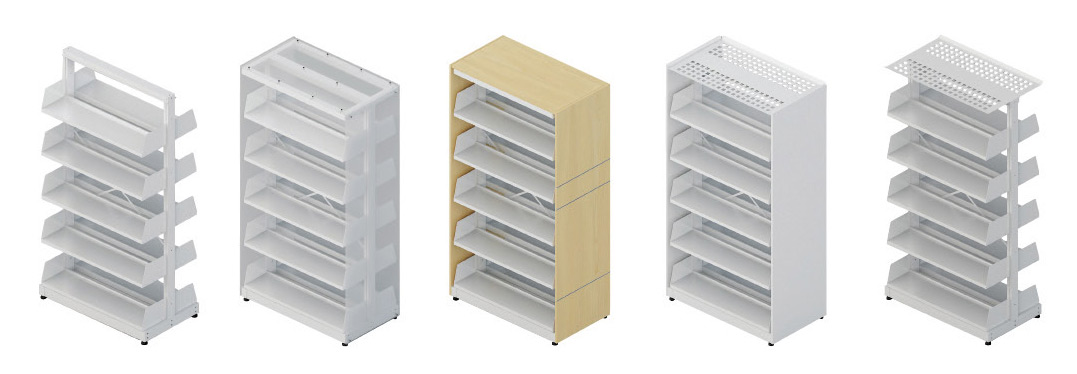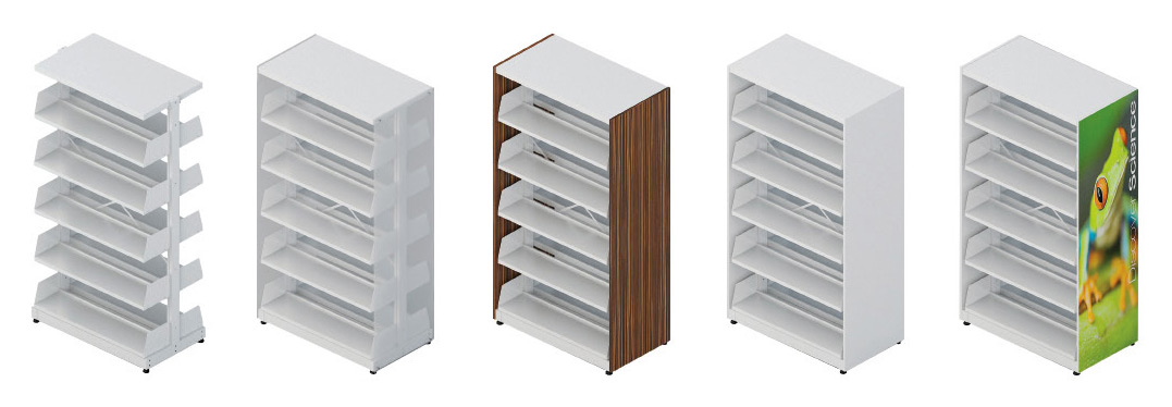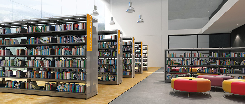 Various styles of library shelving can be finished with glass, acrylic, steel or wood design in colors suitable for the interior.